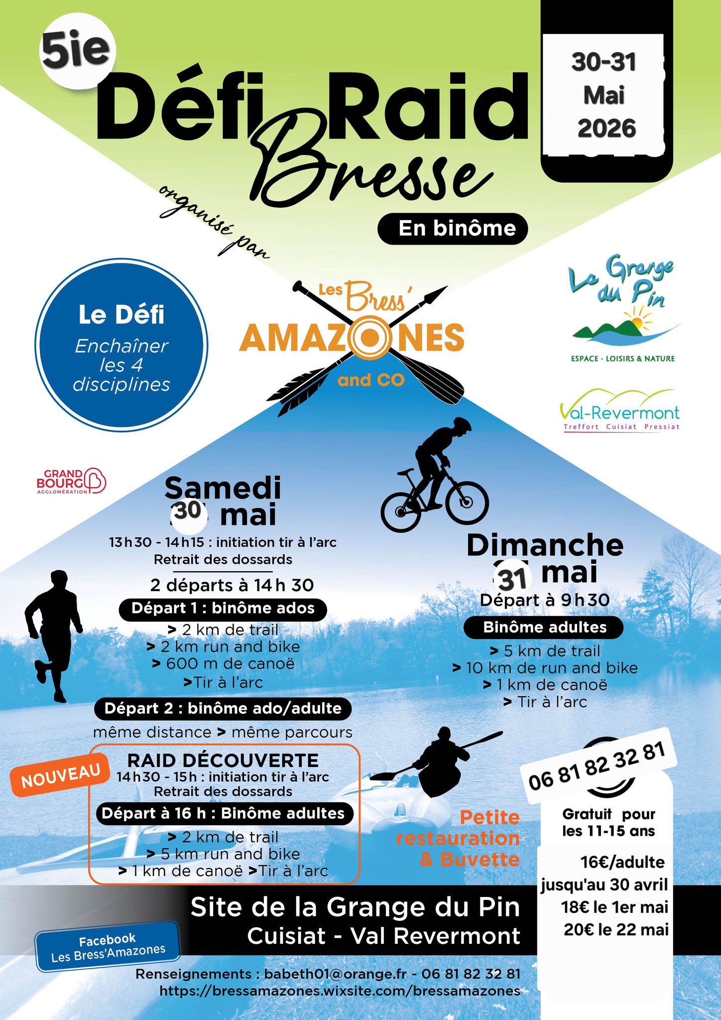 Les Bress’Amazones vous donne rendez-vous les 30 et 31 mai 2026 pour la 5ième édition du Défi Raid Bresse sur la base de la Grange du Pin de Val Revermont avec les 2 courses à 14h30 + un parcours S pour adulte à 16h le samedi ainsi que le raid adulte le dimanche à 9h30